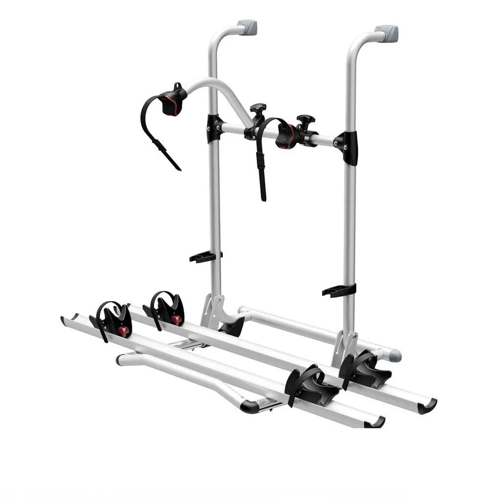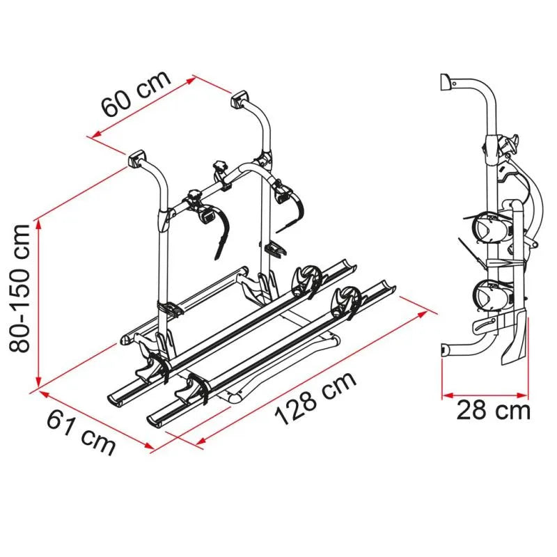 This bicycle rack is equipped with the Rail Premium E-Bike wheel rails. These rails are specially developed for electric bikes to ensure that your bikes are transported neatly. The lower base is specifically set to just take 2 E-Bikes and can not be extended. This rack is generally fitted for the rear wall of a motorhome with no window.