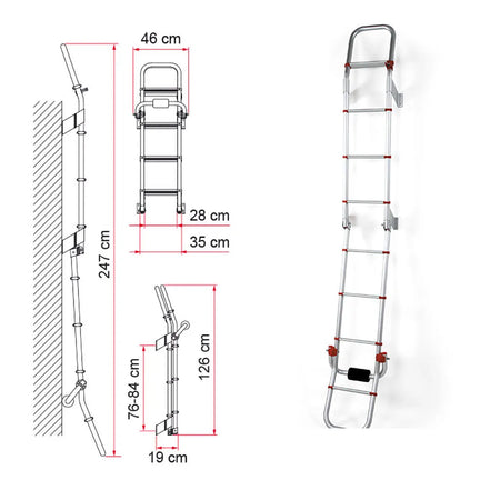External ladder - Sturdy light weight exterior ladder with 8 steps. It can be folded up and locked when not in use or while travelling.