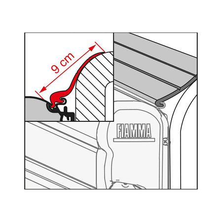 No additional sealant or adhesives are required and it can be installed without removing the Fiamma awning. Fiamma Rain Guard L fits to the hooked lip on the top of the awning case. It rests against the motorhome wall or edge of roof.