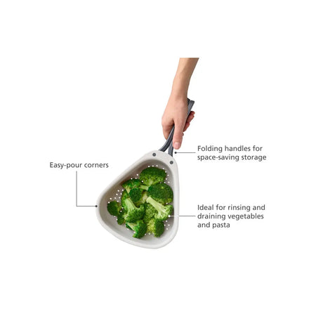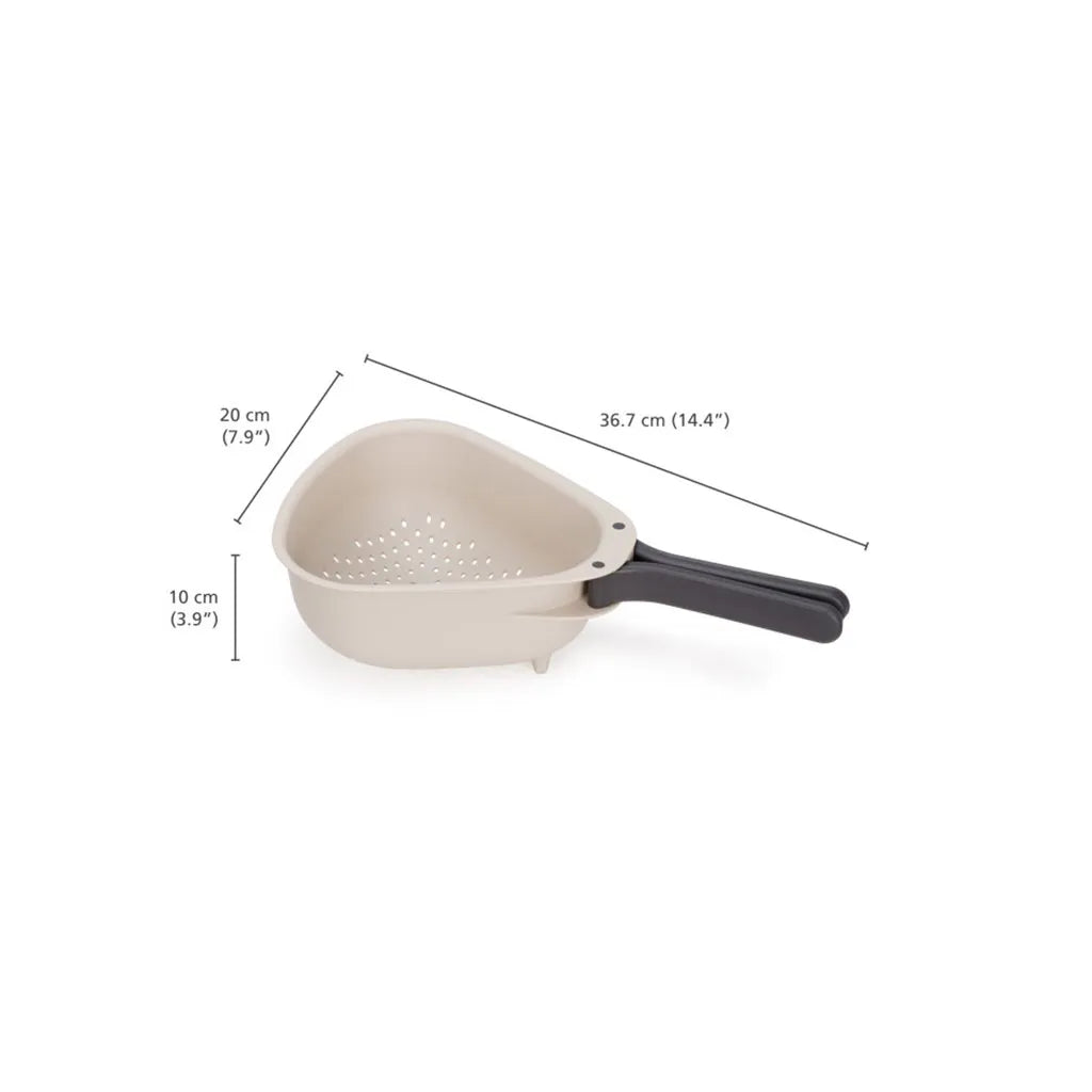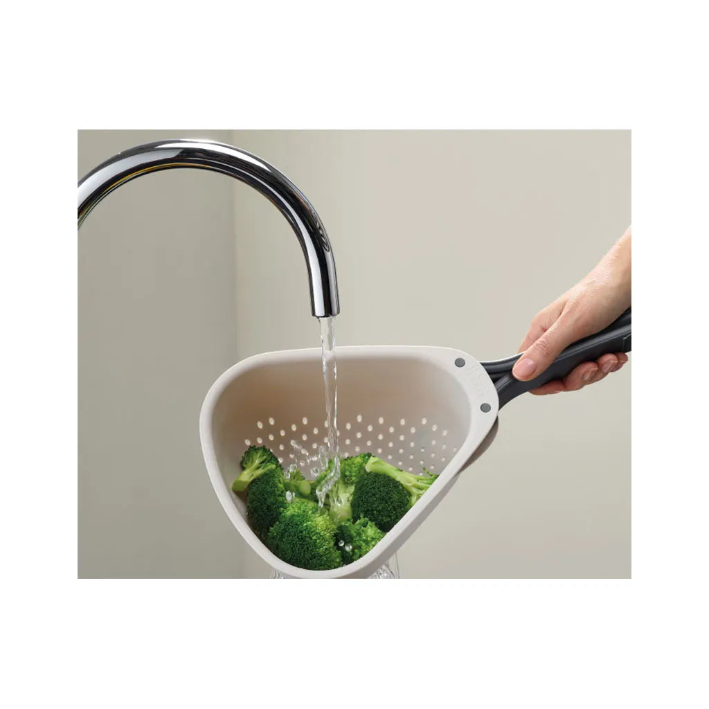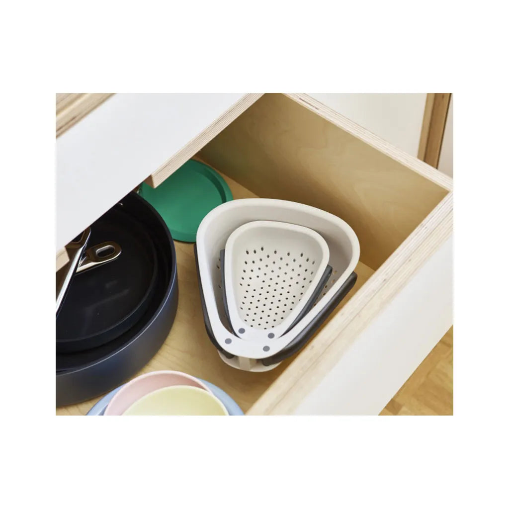 Droplet is a clever colander that features innovative handles that fold to save space in your kitchen cupboard. Its generous size is perfect for draining or rinsing bulkier items of food like vegetables or pasta. After use, simply fold the handles in for space-saving storage.