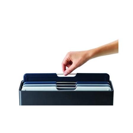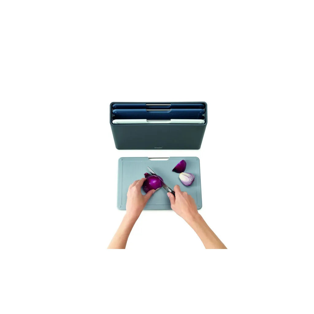 Keep all your chopping board needs beautifully organised with this sleek design. It features a slimline storage case containing four, large colour-coded boards each with knife-friendly, textured cutting surfaces on both sides and non-slip feet. The boards themselves can be easily removed from the case due to the smart angled design and their stainless-steel selecting bars. The case holds each board neatly apart, allowing air to circulate, and has non-slip feet on the base. Available in a range of sizes and case colours.
