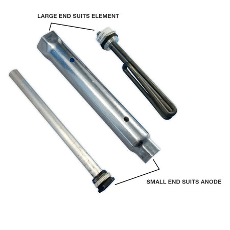The specially designed tube spanner has a 1 1/16" socket to suit Suburban anodes on one end, the other end has a 1 1/2" socket to suit the element. The overall length is 250mm providing the clearance needed for a correct connection and easy loosening - meaning you won't damage the nut in the process.