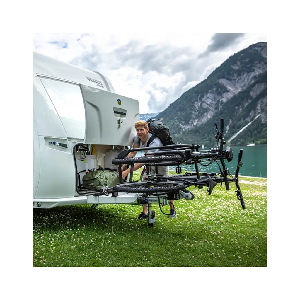 A top-of-the-range bike rack for the A-Frame of your caravan. Available in two frame sizes to cater for every A-Frame. Tilting forward with the bikes attached, allow you access to the front locker. With the addition of wheel holders it fits almost any type of bike.