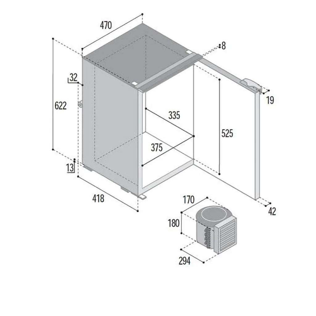 Attached compressor mounts separately alongside or behind fridge, up to 1mt away